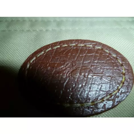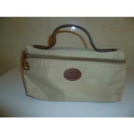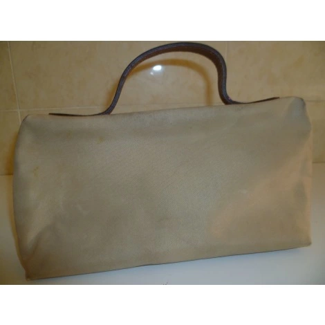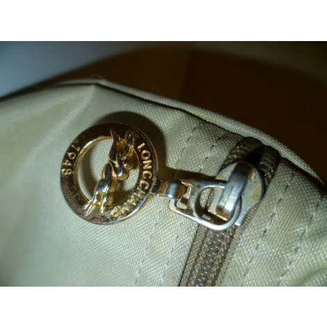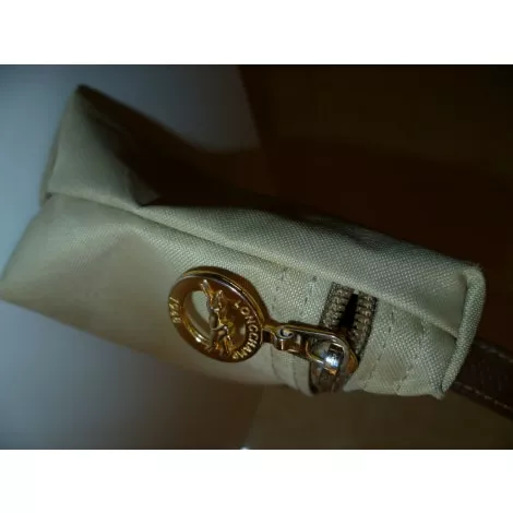 Pochette de la Collection Pliage de Longchamp beige et marron en toile et cuir fermé par fermeture Eclair avec le sigle Longchamp et anse en cuir, numéroté à l’intérieur 43054