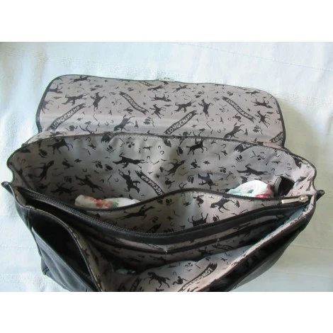 Dès ouverture on trouvera plusieurs compartiments, 4 au total, avec plusieurs poches. L’intérieur est monogrammé Longchamp, photo.