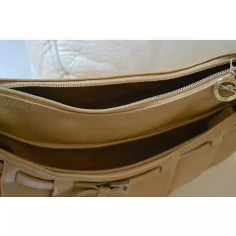 sac porté épaule type hobo Longchamp cuir “le foulonné” beige. Une boucle argentée sur le devant. Une poche zippée extérieure avant.