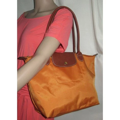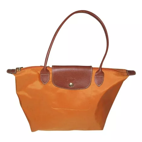 Très sac de chez Longchamp, modèle shopping de la ligne pliage, en toile orange avec parties en cuir coloris marron, photo.