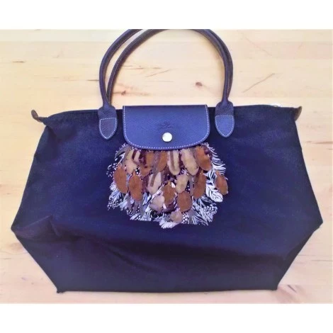 Sac à Main “Longchamp” modèle pliage, en tissu couleur noir à déco plumes et anses en cuir, fermeture à glissière, dimensions 39 cm x 25 cm, bé.