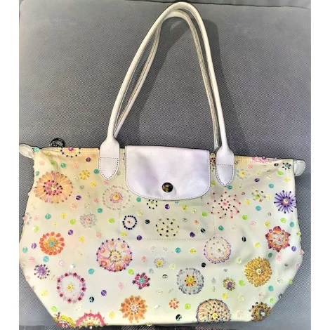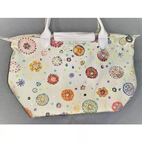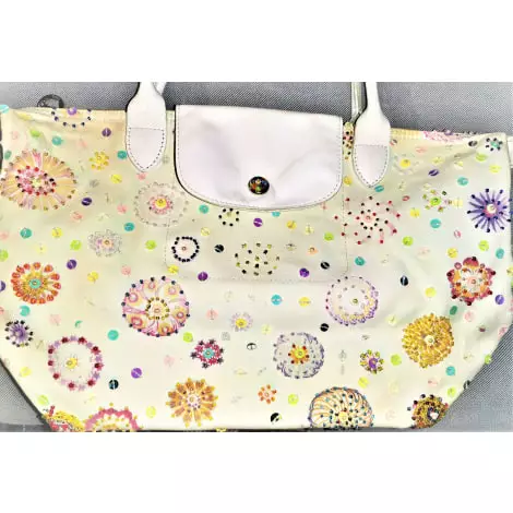 Sac à Main “Longchamp” modèle pliage, en tissu couleur crème à fleurs brodées en perles et anses en cuir, fermeture à glissière, dimensions 39 cm x 25 cm x 14 cm, bé.