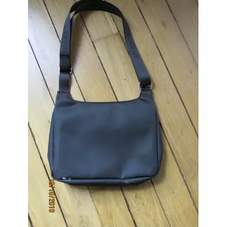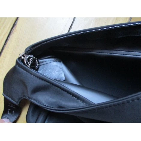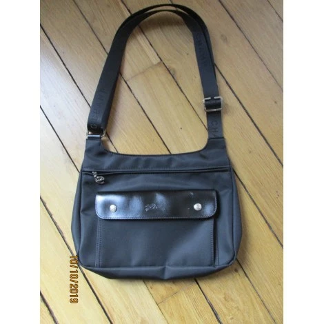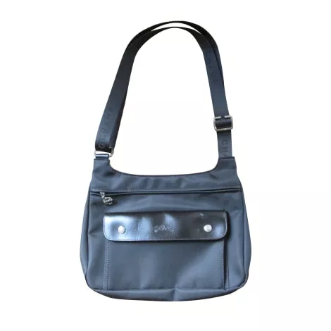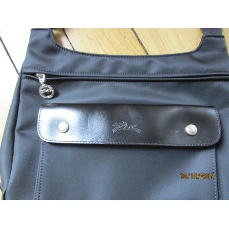 Poche rabat cuir,fermée par 2 pressions signées. Bandoulière réglable nylon noir, imprimée Longchamp.