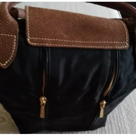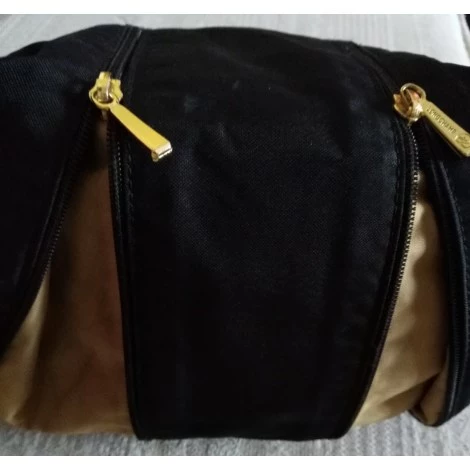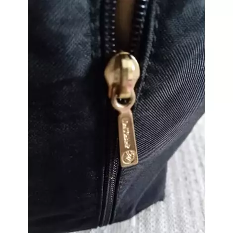 Sac à main en toile0 noir extensible avec 2 chaînes zippées qui puissent l’élargir et laissent voir une couleur jaune ocre il est petit et chic.