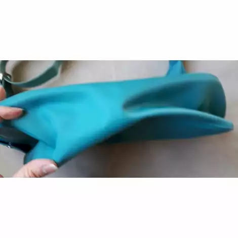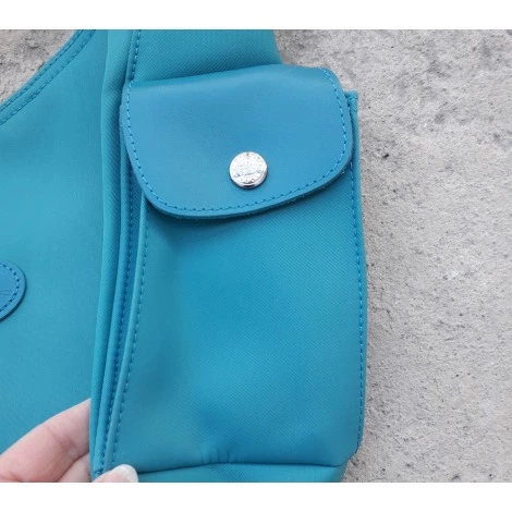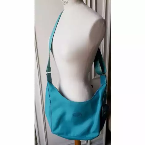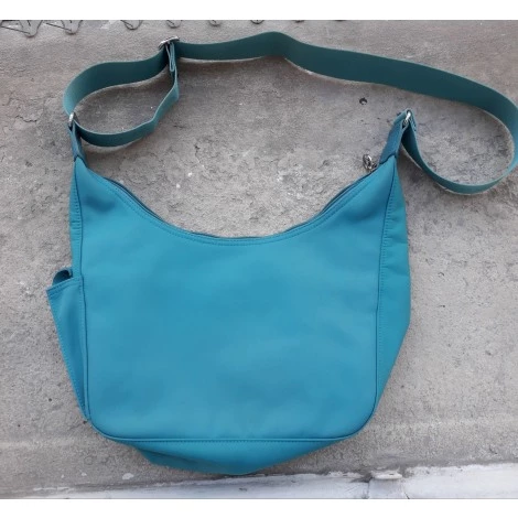Ouverture Fermeture éclair , interieur petite poche fermeture éclair. Vouleut turquoise foncé ou bleu canard. Grande et large sangle siglée, réglable, poche côté pour téléphone. Dimensions 21 sur 32 envi6, poche téléphone 14/15 sur 8, côté 3,5. Pression. Petit éclaircissement aux extrémités de la sangle , sans gravité sinon très bon etat.