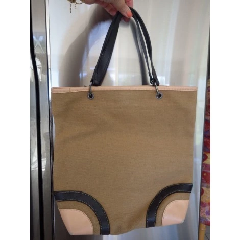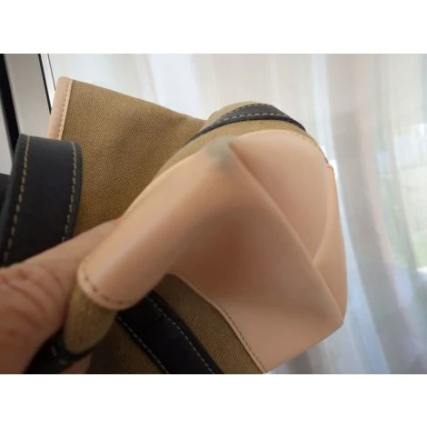 sac en toile beige avec parements cuir marron foncé et beige clair aux coins et en haut, deux anses en cuir marron, fermé par bouton pression, petite poche zippée à l’intérieur, dimensions 34x32x12cm, les anses ne sont pas très longues mais il peut se porter à l’épaule ou au bras, coins légèrement usés (un coup de cirage devrait suffire) et quelques taches à l’intérieur le reste du sac est impeccable, prix en conséquence.