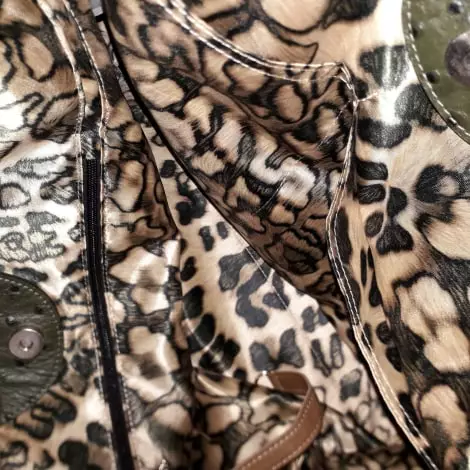 int: doublure satin léopard nickel, 2 poches+ 1 poche ferm.éclair+1 accroche clefs.